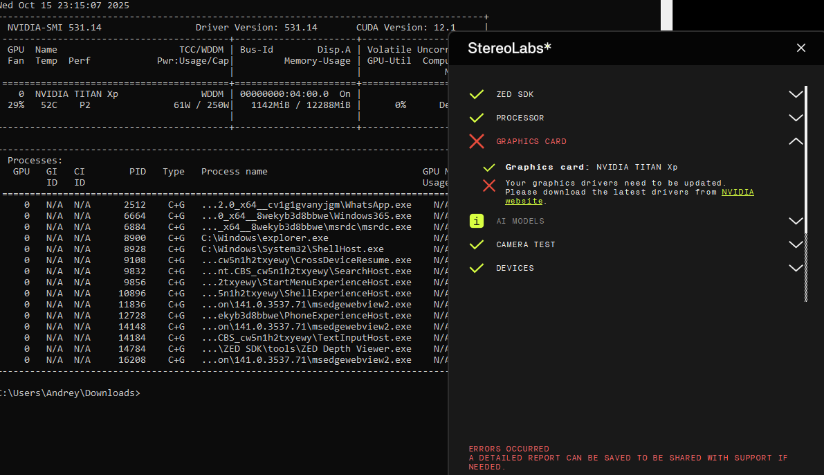 given cuda 12.1 comes with driver version 531 the zed sdk won’t work saying all good but driver needs updated to latest. which is misleading