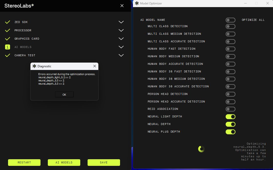 did run the ZED Diagnostics.exe with aic parameter. Cleared. Same result. Optimization fails.