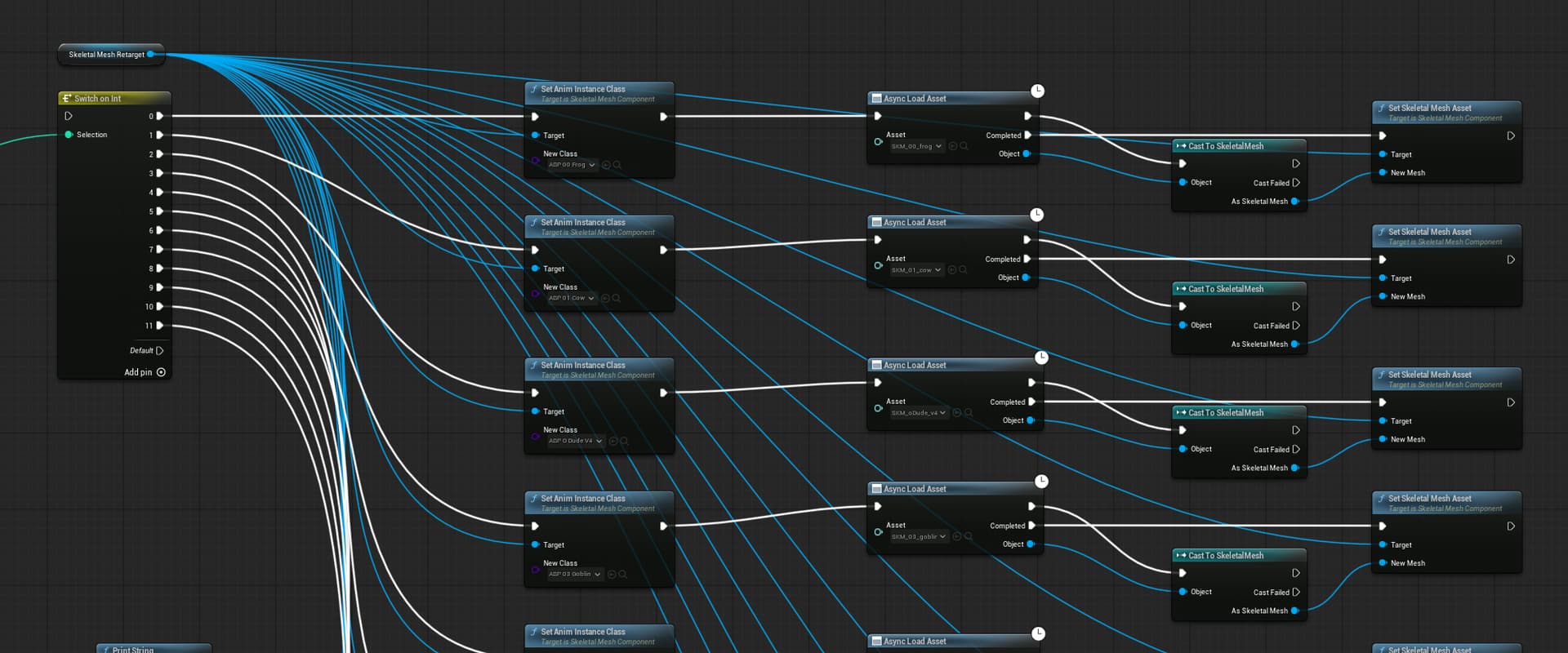 Like I was saying in the last message, I am trying to switch in-game the avatar from another app via OSC. And like you see in the attached images, depending on the OSC tag I get, I switch between the preset ABP + Skeleton Mesh pair. But it only switches one single avatar. So for example if there 2 players, it only changes for one player but not for the other.