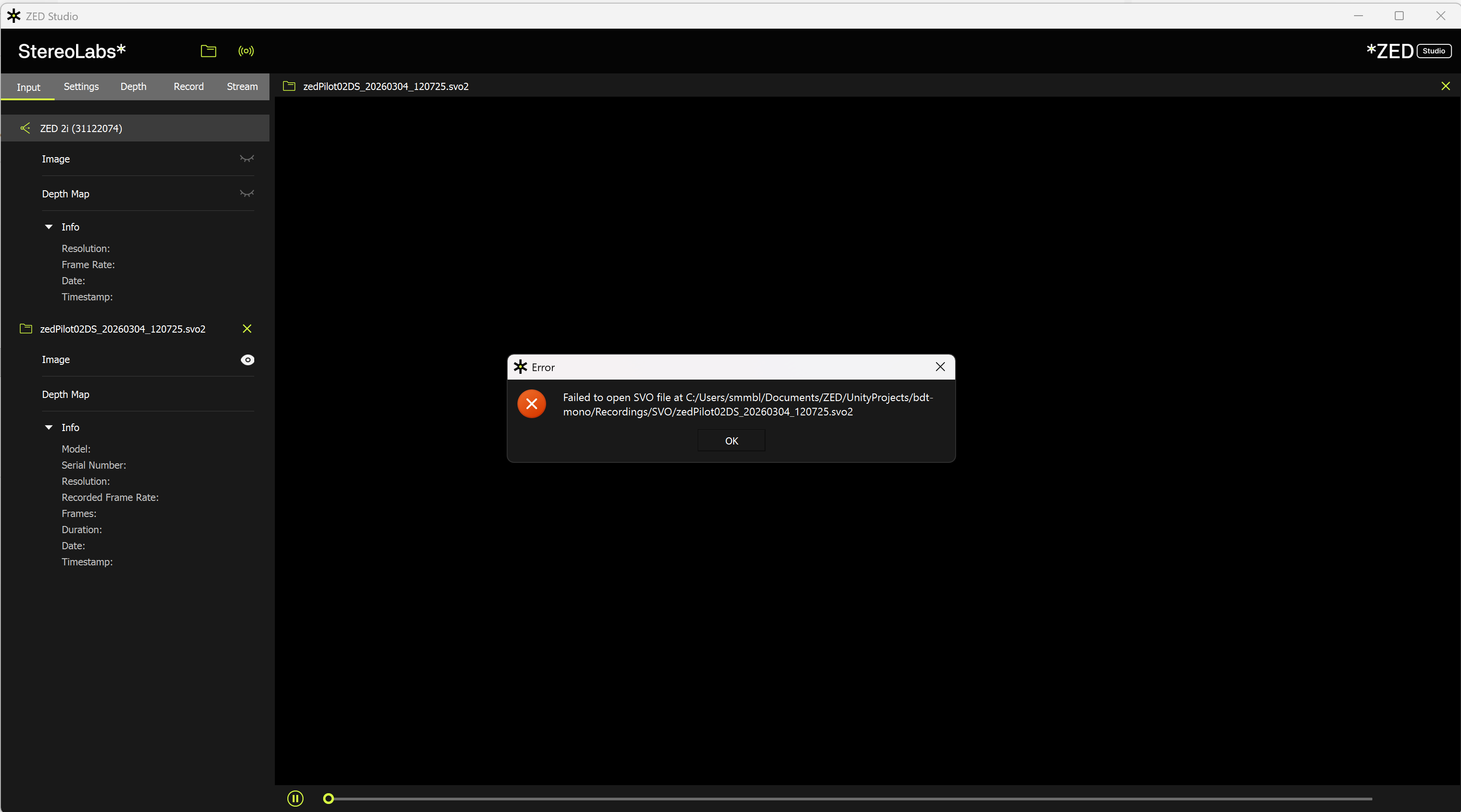 Recording finishes normally, but when the SVO2 file becomes large, ZED Studio fails to open it: