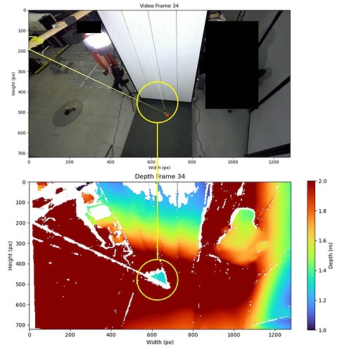 I am consistently seeing the “soap bubble” illustrated in the frame above; what should be red (floor, a depth of over 2m from the camera) is being reported as the depth of the pendulum string.
