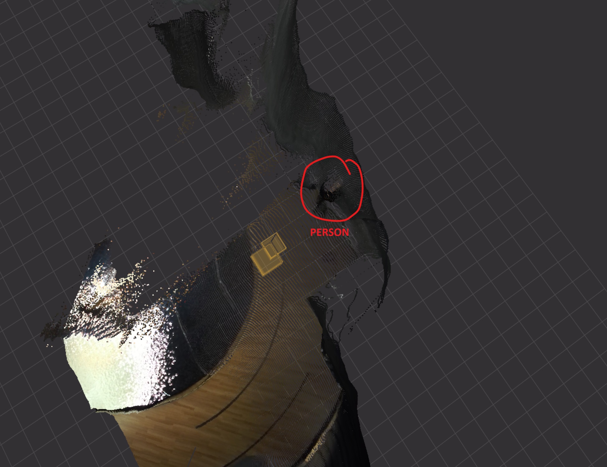 As you can see, only parts of their tracking space overlaps. When a person stands in the area marked red, it can happen that they produce a ghost detection that is strangely placed ~1m in front of them. See the next screenshot where ID 47 and 100047 are the same tracked person, yet placed at different positions with the bounding box of 47 hovering in mid-air.