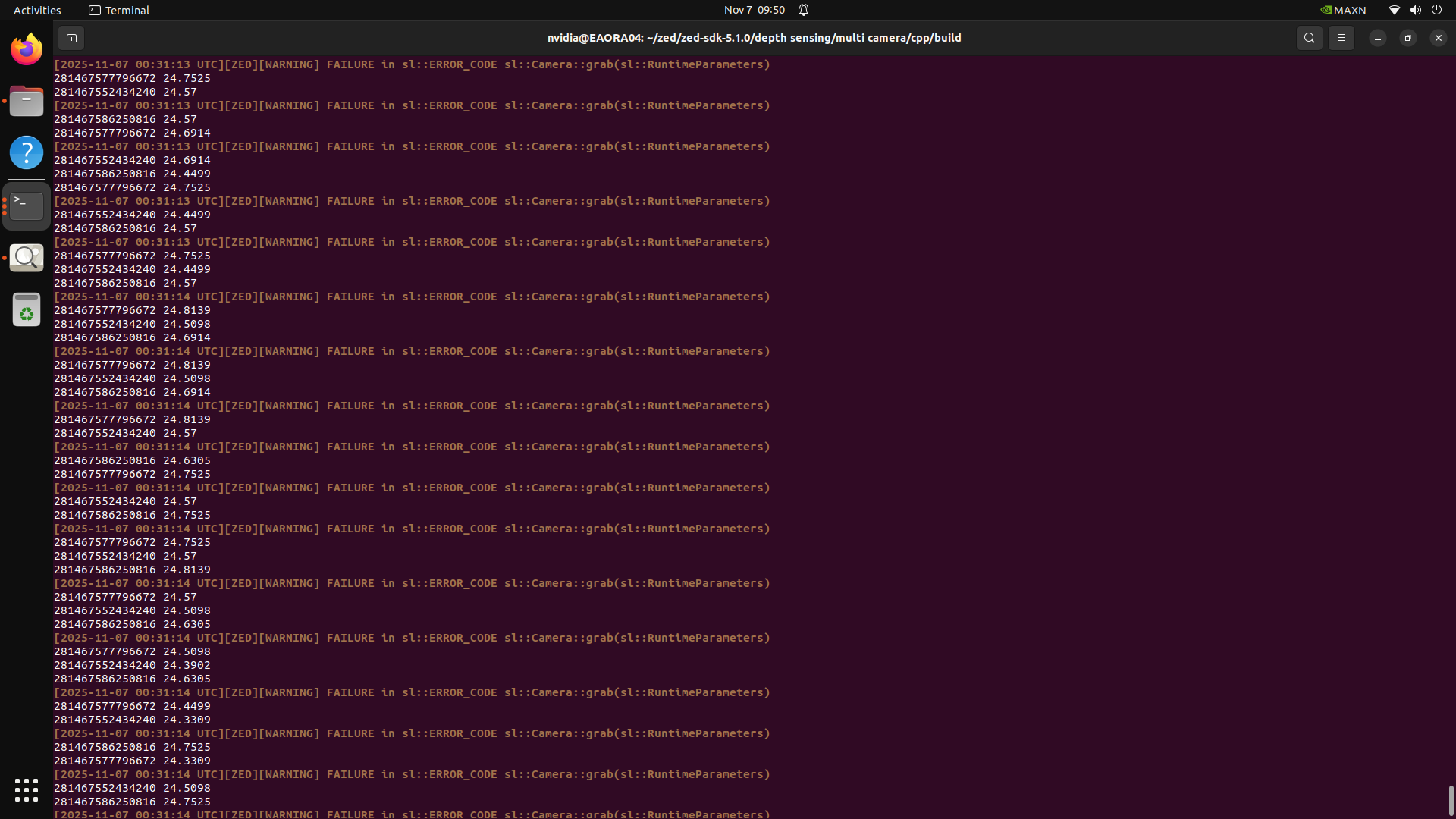 Nov 6 17:50:53 EAORA04 nvargus-daemon[1000]: SCF: Error InvalidState: Failed to set the metadata for the frame (propagating from src/services/gl/EGLStreamProducer.cpp, function setFrameMetadata(), line 466)
