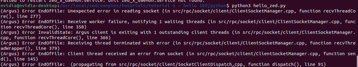 I’ve installed the SDK and the python API. However, when I attempt run hello_zed.py I get the error messages described in the attached screenshot. I have tried restarting the nvargus-daemon to no avail. Appreciate any help.