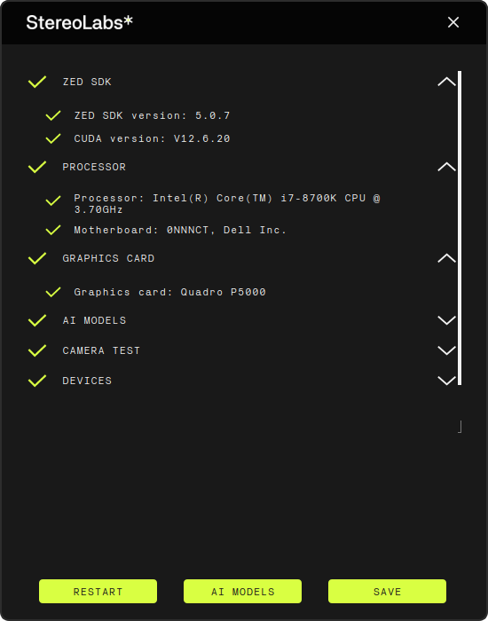 I’m working on a PC. I have already tried to install the newest SDK, but it couldn’t optimize the ai models as I have a Pascal GPU (Quadro P5000), which I think isn’t adequate with TensorRT 10. But SDK 5.0 offers versions with TensorRT 8 for Pascal GPUs, which passed through all the tests of the ZED Diagnostic.