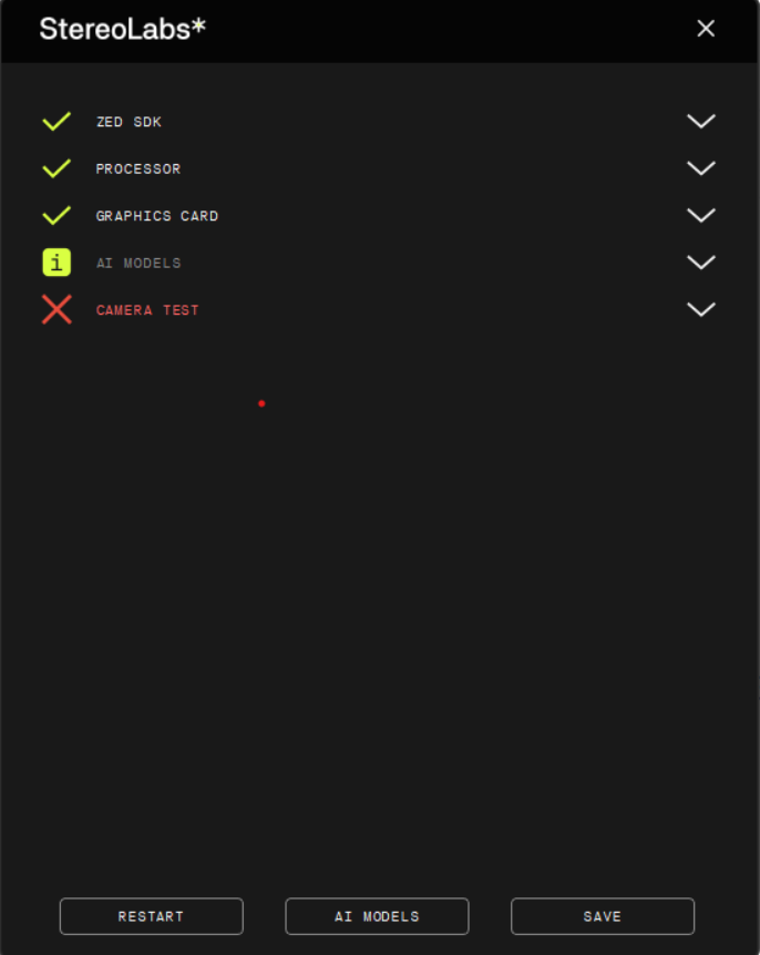 ZED Diagnostic - Please see screenshot below. I believe the camera test fails because I am not using a physical camera. Instead, I am trying to setup the virtual camera. Also, ZED Diagnostic suddenly crashes and I am unable to save the results from the diagnostic. I have seen other people see this issue as well where the ZED Diagnostic just crashes.