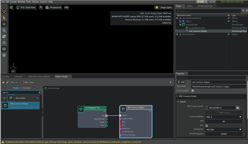 Then, I created the Action Graph as mentioned in the tutorial. However, when I create the ZED Camera Helper node, I get the following warning