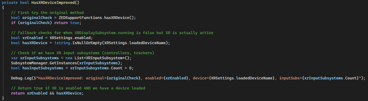 Debug.Log($"HasXRDeviceImproved: original={originalCheck}, enabled={xrEnabled}, device={XRSettings.loadedDeviceName}, inputSubs={xrInputSubsystems.Count}");