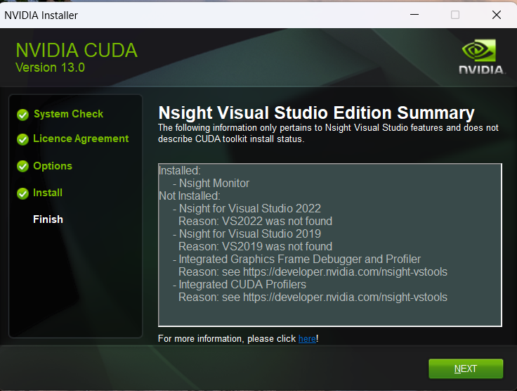 In next window NVIDIA Installer has finished every Component has Status Installed
