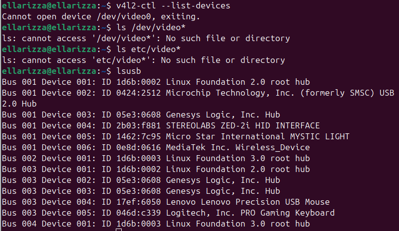 I’ve attached another report from ZED diagnostic. This time, the camera test succeeded. But when I use command lines to check for video devices, it cannot be found. I check lsusb and the USB device is recognized. No video device is also found by guvcview.
