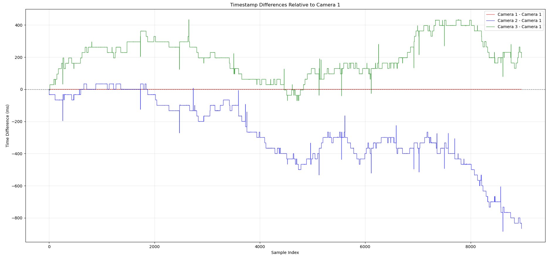 In this plot, the time difference of each camera wrt the camera 1 are shown. The plot is showing a recording of 9000 samples which is 5 min at 30 fps.