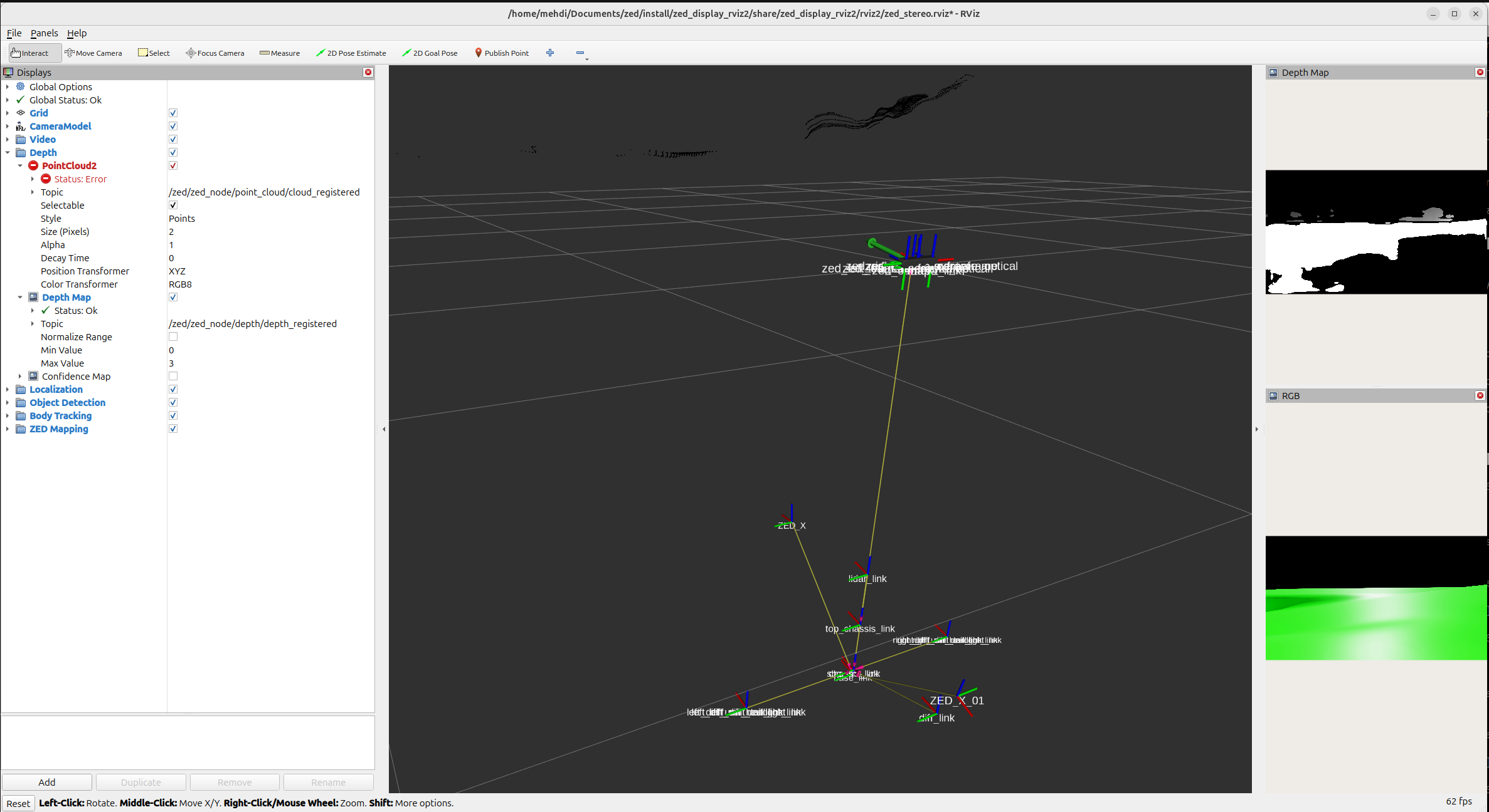 In RViz, the wrapper’s zed_camera_center frame appears far above the robot body (see screenshot). This also causes the registered point cloud topic (/zed/zed_node/point_cloud/cloud_registered) to report a Status: Error because the transform chain from the point cloud frame to the fixed frame is broken.