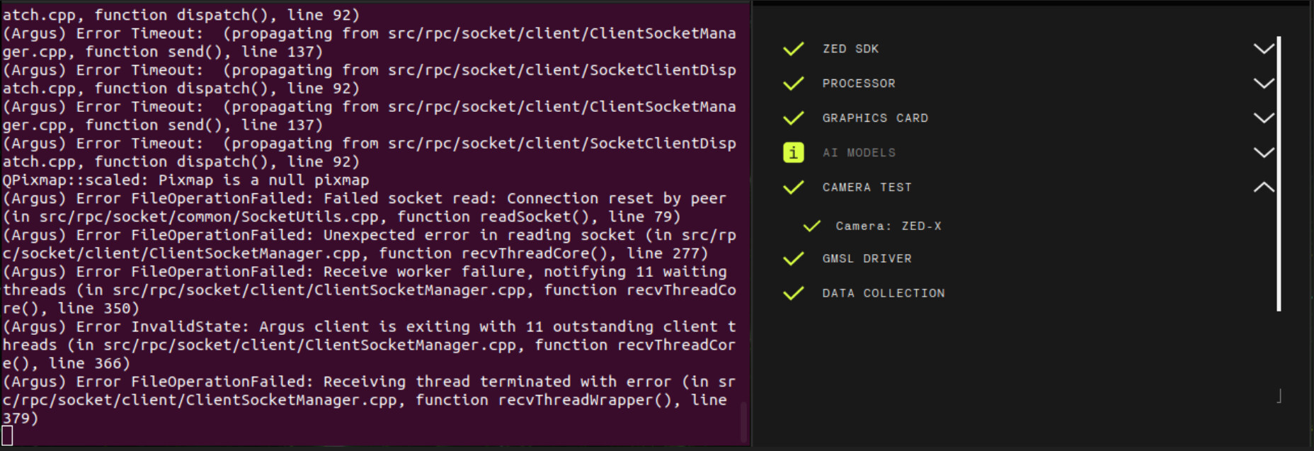 The same goes for the diagnostic tool - the diagnostic sometimes passes saying that everything should be working fine, when the camera is clearly not initialized, or right as Argus is throwing socket reading errors: