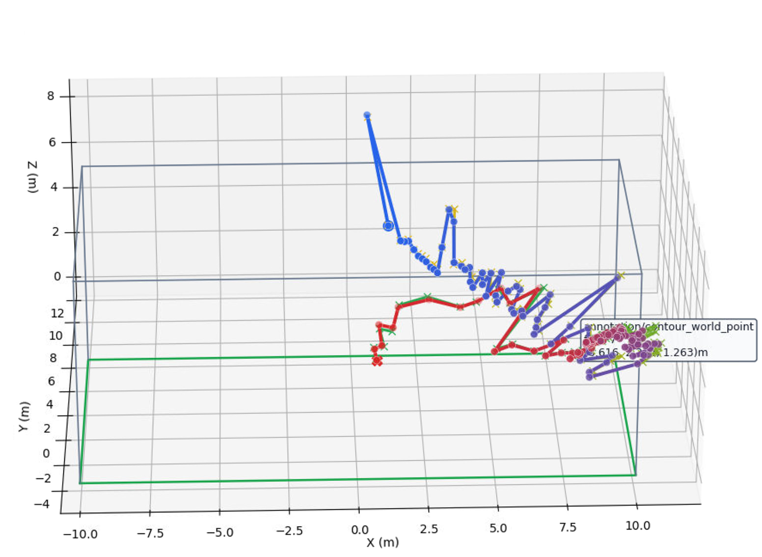 We would expect a quite parabolic flight but instead get a saw pattern oscillating on the depth axis (roughly) with >1 meter error which is huge. The approximate distance is ~8 meters and