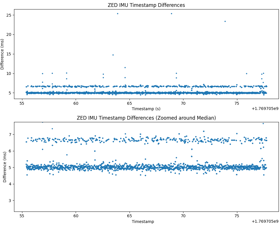 Moreover, I noticed that I am getting kind of two rate distributions in the data I collect. Here I am plotting the period between IMU samples. This is also visible in the data I collect using the Zed Explorer, or the sensor viewer. The only setup without this two distributions is using the Zed Explorer with 1080p 15Hz cameras.