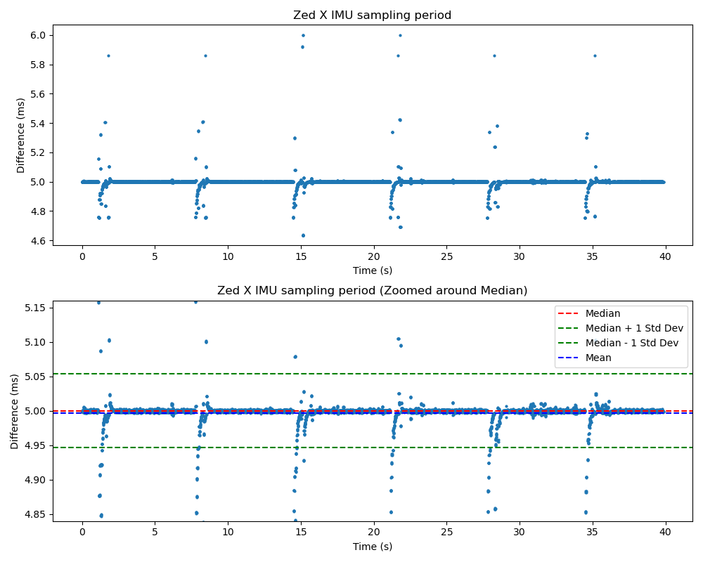 We’ve recently released the ZED SDK 5.2 and ZED X Driver 1.4, which come with improvements in IMU stability where the IMU rate spread improved from ~11 Hz (185–197 Hz) to < 1 Hz (199.5–200 Hz) and fixed data drop issues in complex setups involving 8+ IMUs.