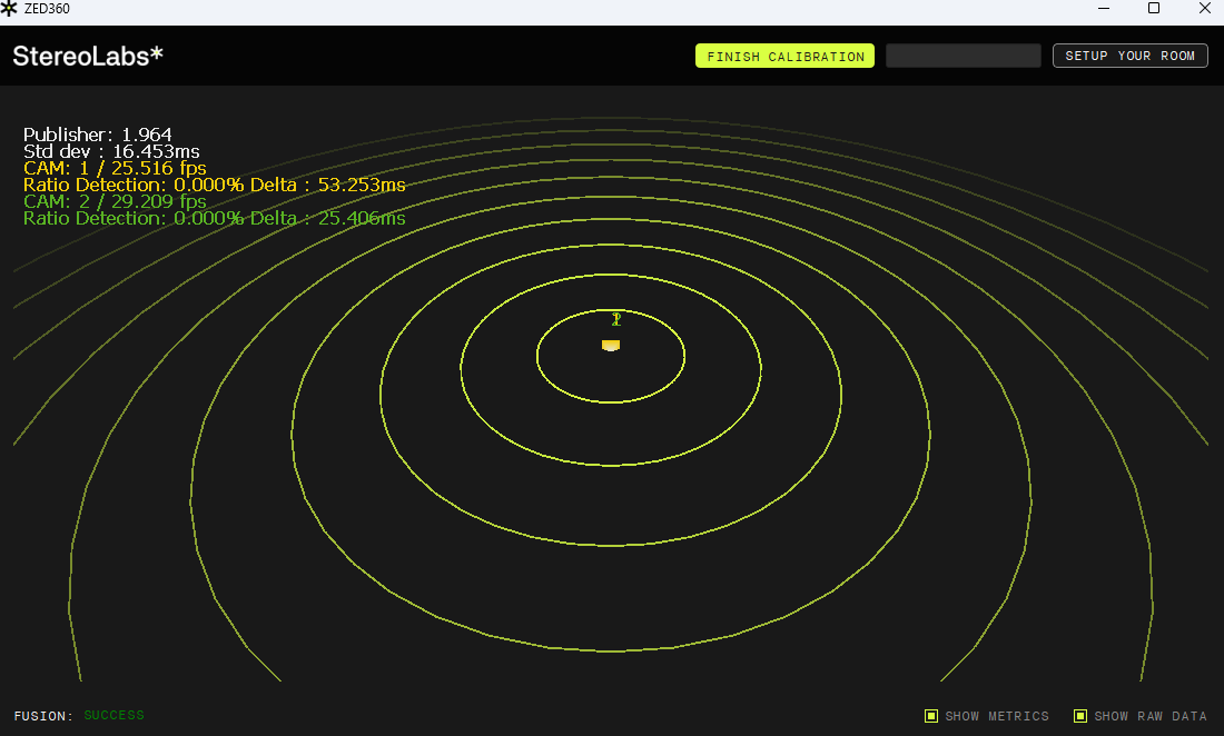 Sometimes zed360 just crashes when trying to setup the room. Sometimes it does not and adds both cameras in one spot. See attached image. When in calibration it does not show any bodies detected or moving and calibration saves no data.
